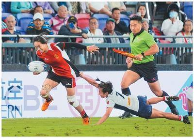 11月12日,十五运会七人制橄榄球比赛在这座能容纳5万名观众的场馆拉开帷幕。球场上,来自全国各地的队伍在绿茵奔跑、对抗,普通话和粤语广播在看台上回荡,观众的欢呼与音乐的节拍此起彼伏。